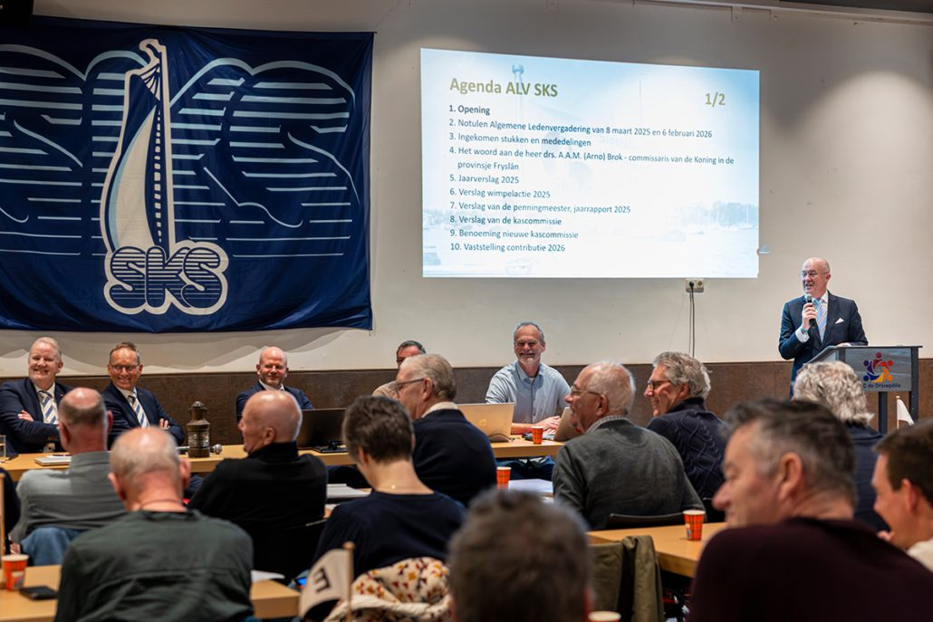 De Algemene Ledenvergadering (ALV) van de Sintrale Kommisje Skûtsjesilen (SKS) in de Driuwpôlle in Woudsend verliep op zaterdag 7 maart vooral feestelijk. Commissaris van de Koning Arno Brok was op bezoek en sloot het jubileumjaar af, er werden vijf leden van verdienste benoemd en na het sluiten van de vergadering werd een koninklijke onderscheiding uitgereikt.
